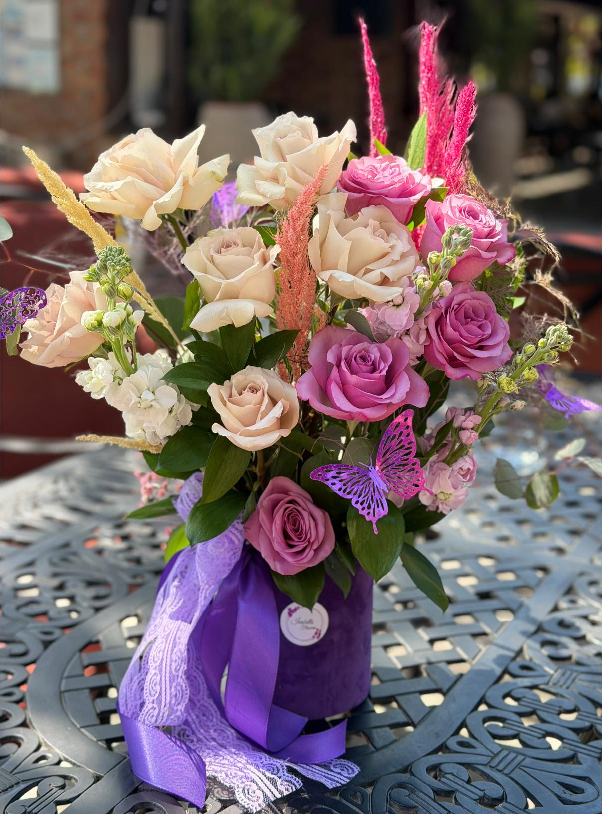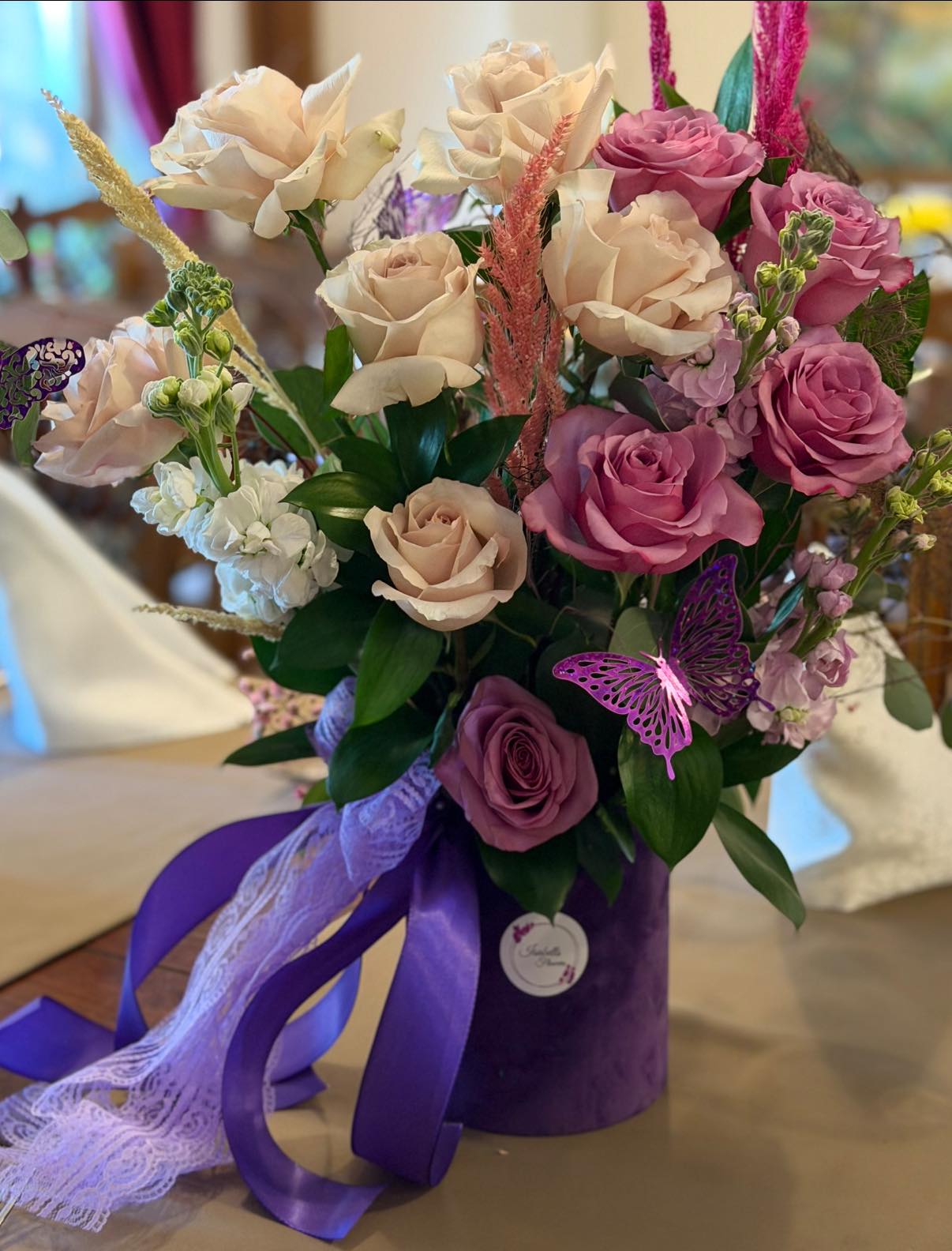 Acest aranjament floral este realizat in cutie de catifea personalizata , compus intr-o tema florala la alegerea floristului.